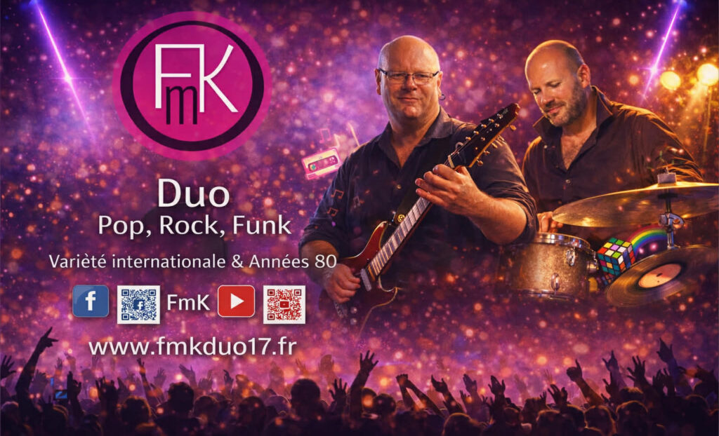 FmK est un duo musical professionnel basé en Charente-Maritime, ayant un répertoire pop-rock-funk. Nous animons vos événements avec une grande variété de chansons et une ambiance inoubliable.